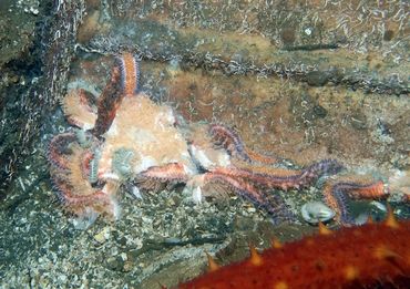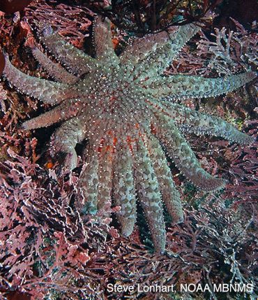 In 2013 I was diving in the cold waters of Puget Sound in Washington State and I saw many huge, twenty-armed sea stars turning to goo. Sea Star wasting disease caused stars to disintegrate right on the reef or sand, leaving a ghostly white star shape behind. The disease quickly decimated many species of starfish over the entire west coast from Baja to Alaska.